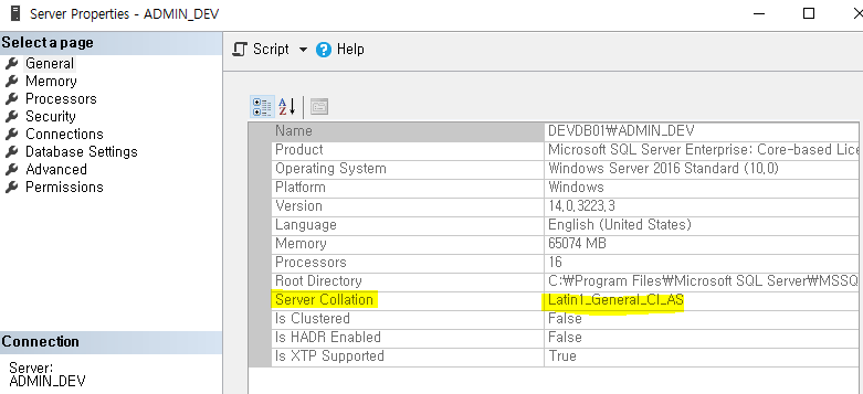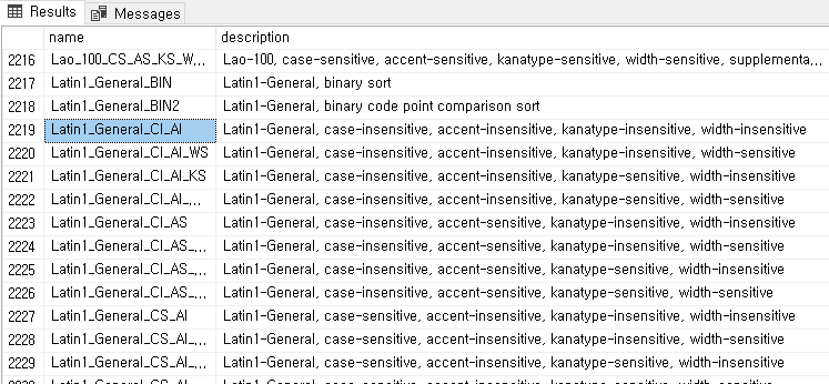 Latin1_General : 일반적인 영어권 문자 정렬, 다른 특별한 정렬방식이 명시적으로 지정되지 않는한 사전 순서가 기본 값