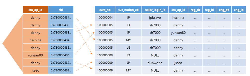 이 때는 컬럼 정보가 필요하다면 rid 값을 해석하여 테이블 로우를 찾아가는 게 아니라