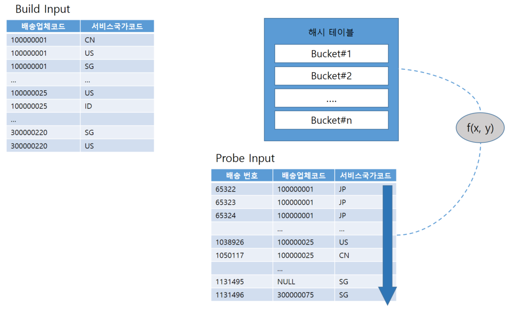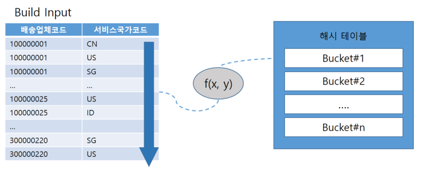 1. Build 단계 : 우선 작은 쪽 테이블인 배송업체 관리 테이블(약 400건)을 스캔해서 해시 테이블을 생성