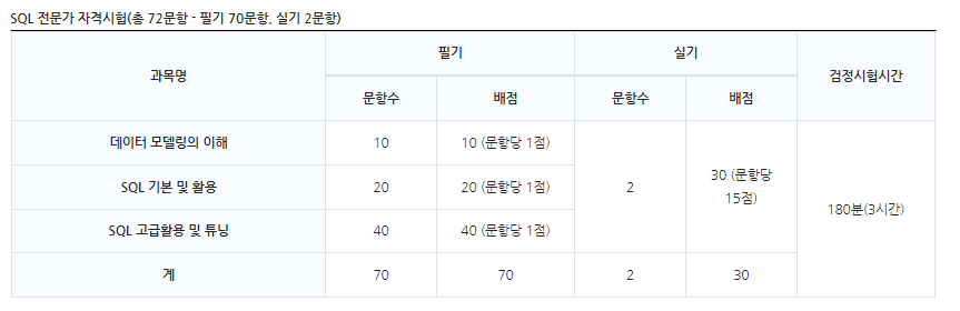 필기를 보면 데이터 모델링의 이해, SQL 기본 및 활용은 30점, SQL 고급활용 및 튜닝은 40점입니다.